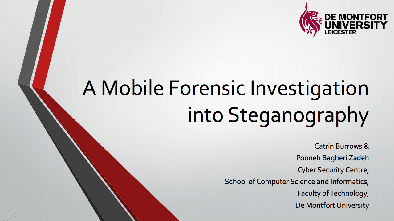 He is an interesting presentation by Catrin Burrows & Pooneh Bagheri Zadeh from De Montfort University on steganography in the context of mobile forensic investigations.