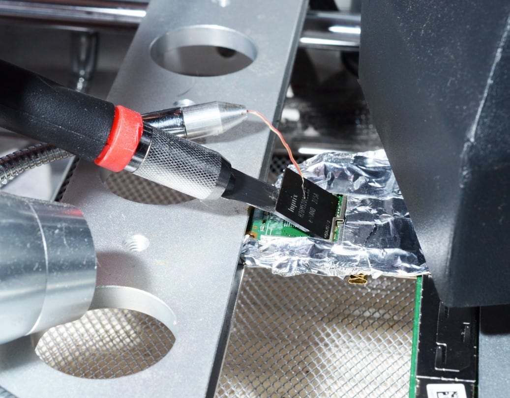 Chip unsoldering is the most important part of chip-off process. The chip mustn’t be overheated. It will delete all data. Usually it happens, because an examiner thinks that air isn’t hot enough to melt soldering flux, and increases temperature too much. An examiner should remember, that chip is not only soldered to the board, but also glued with compound. That’s why you should not only heat it, but also try to extract it carefully. We recommend using IR station. Even the simplest IR station with automatic temperature regulator allows unsoldering BGA chips with safety. For standard chips unsoldering temperature is ~225-230 °C, for chips glued with compound – ~240-245 °C.