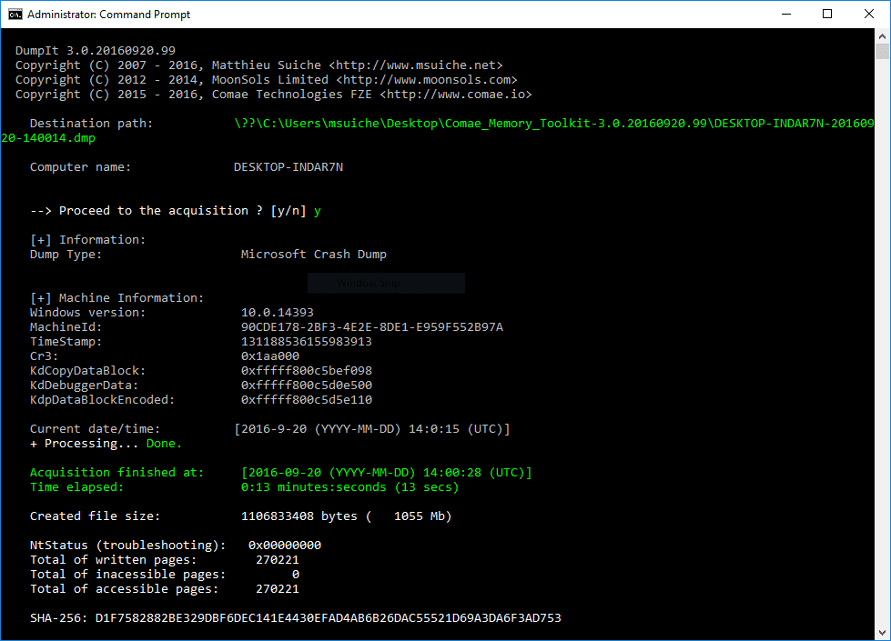 The current version of DumpIt supports from Windows XP until Windows 10 64-bits, and provides extra information during the acquisition such as displaying the Directory Table Base and the address of the debugging data structures.